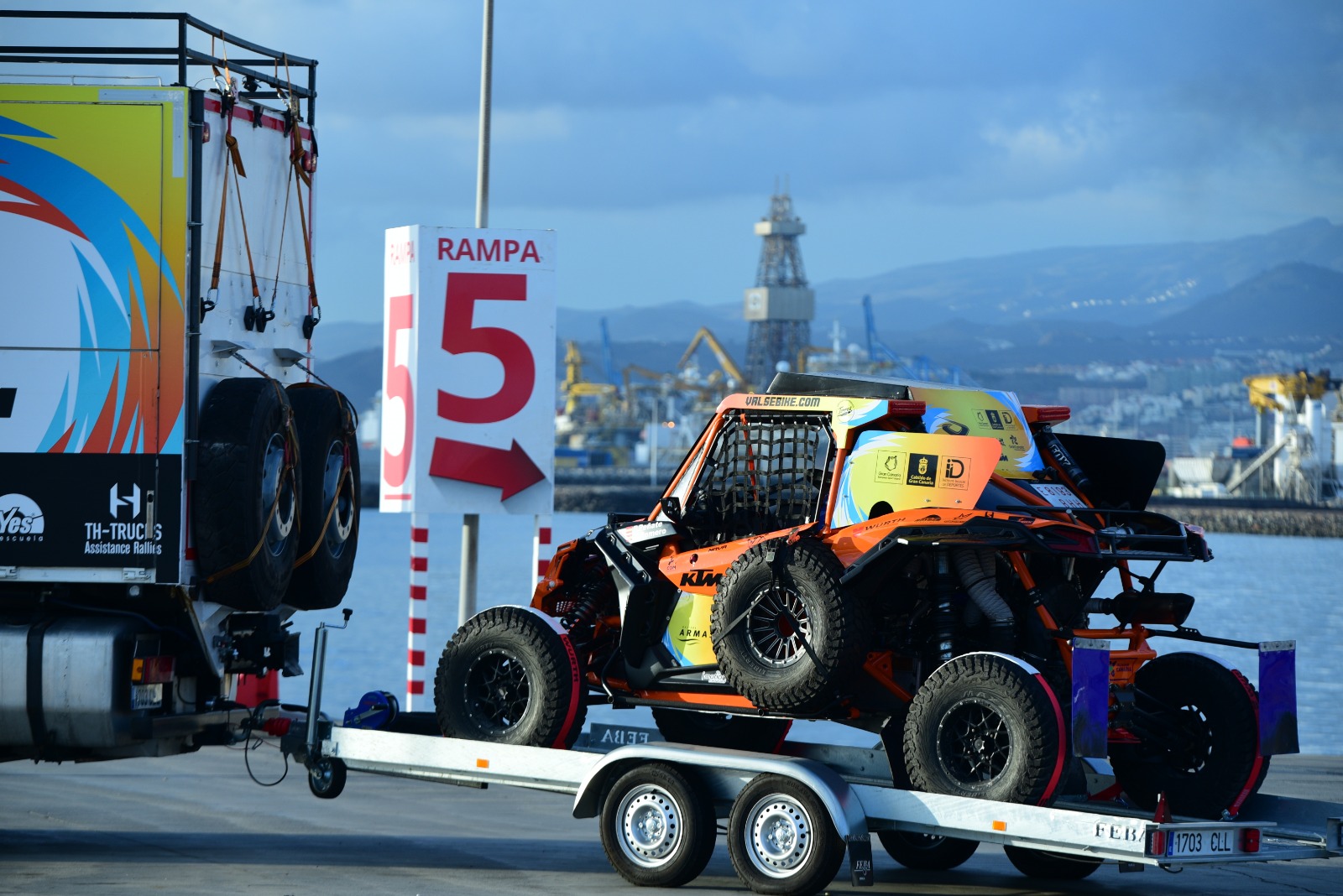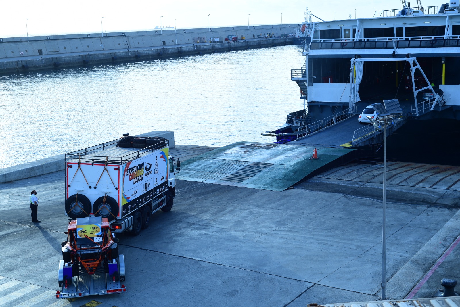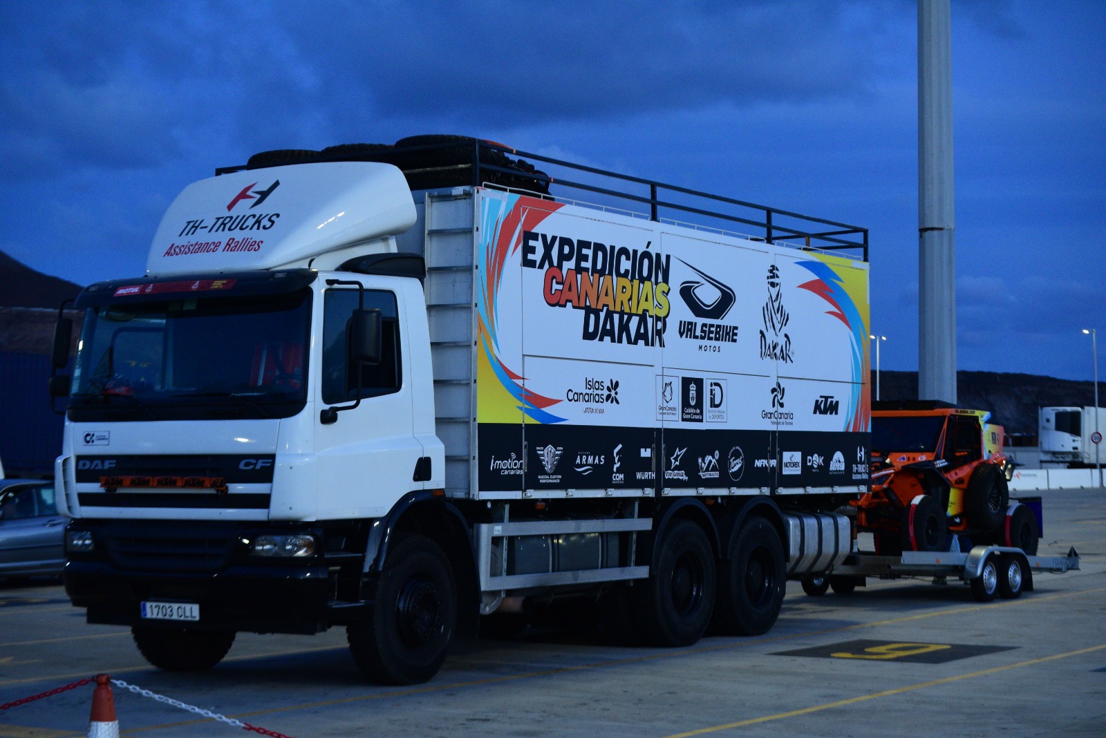 El vehículo totalmente montado y diseñado, junto al camión de logística que acompañará a la Expedición Canarias Dakar 2022, partía esta mañana rumbo a Huelva, en un barco de Naviera Armas, uno de los patrocinadores de la expedición, con Pedro Peñate y José Suárez, de Autoescuela Reyes, quien estará a cargo de toda la logística dela expedición.